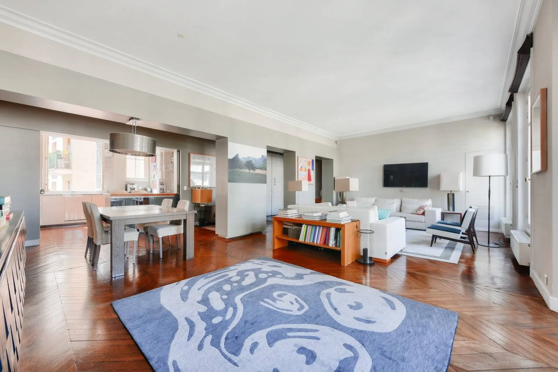 Seul à l'étage, dans une copropriété très bien tenue et sécurisée, l'appartement se compose d'une très belle galerie d'entrée desservant sur un spacieux double séjour très lumineux, une salle à manger et une cuisine semi-ouverte.