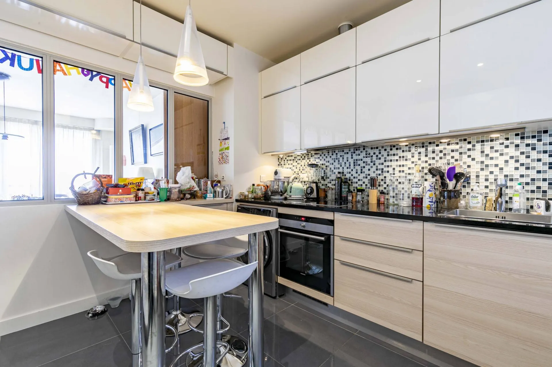 Cet appartement est composé d'une entrée, d'une vaste pièce de vie avec 3 fenêtres, exposé sud-ouest, une cheminée, une cuisine attenante avec verrière sur séjour, 3 chambres, une salle de bain, une salle d'eau, et une cave.
