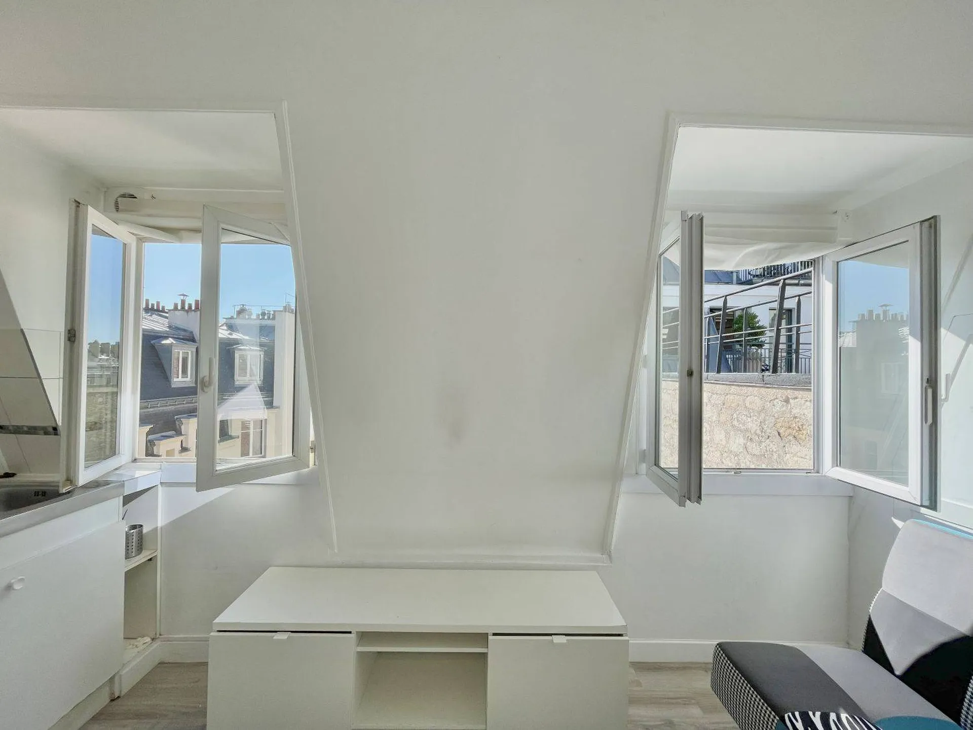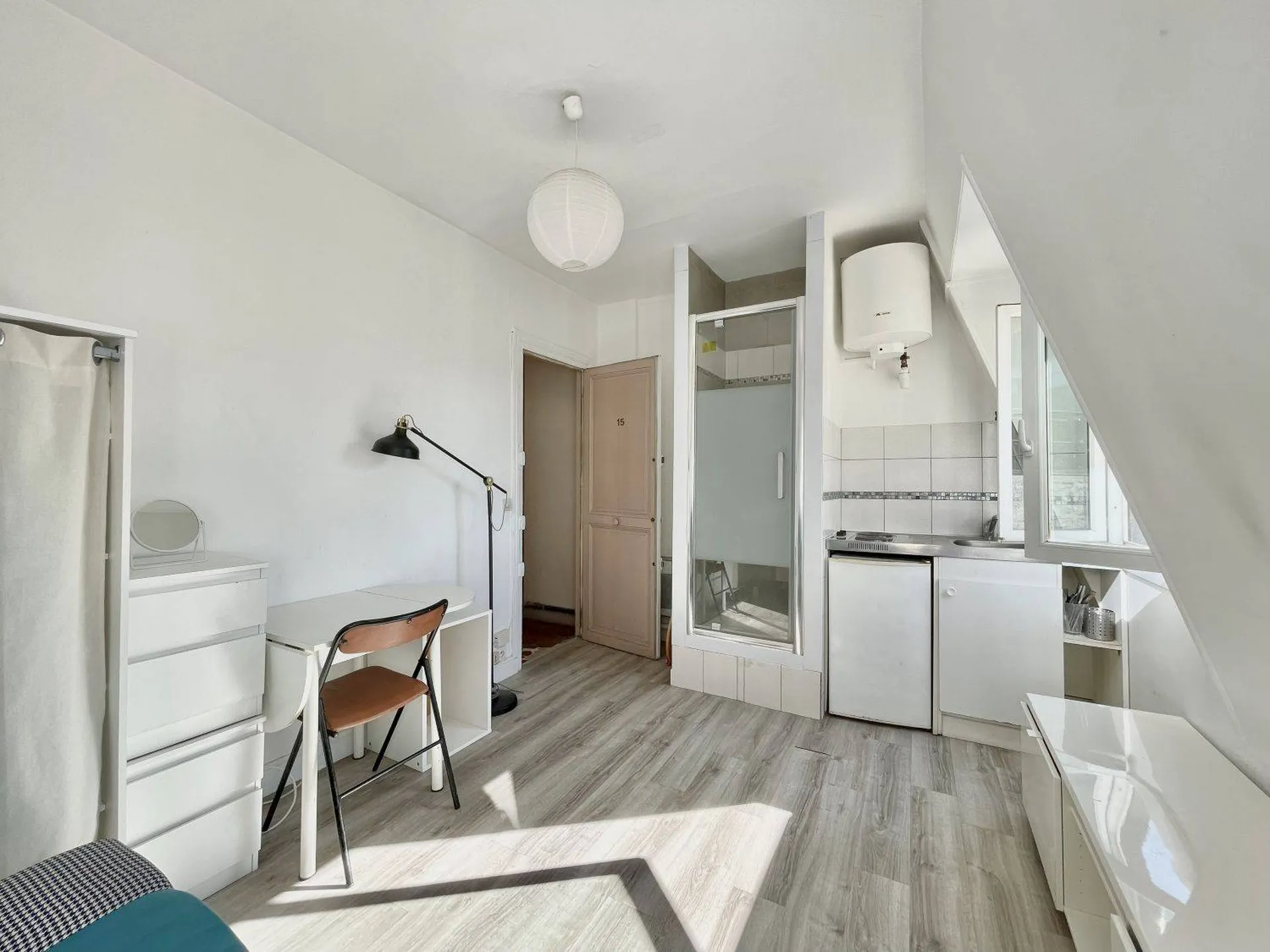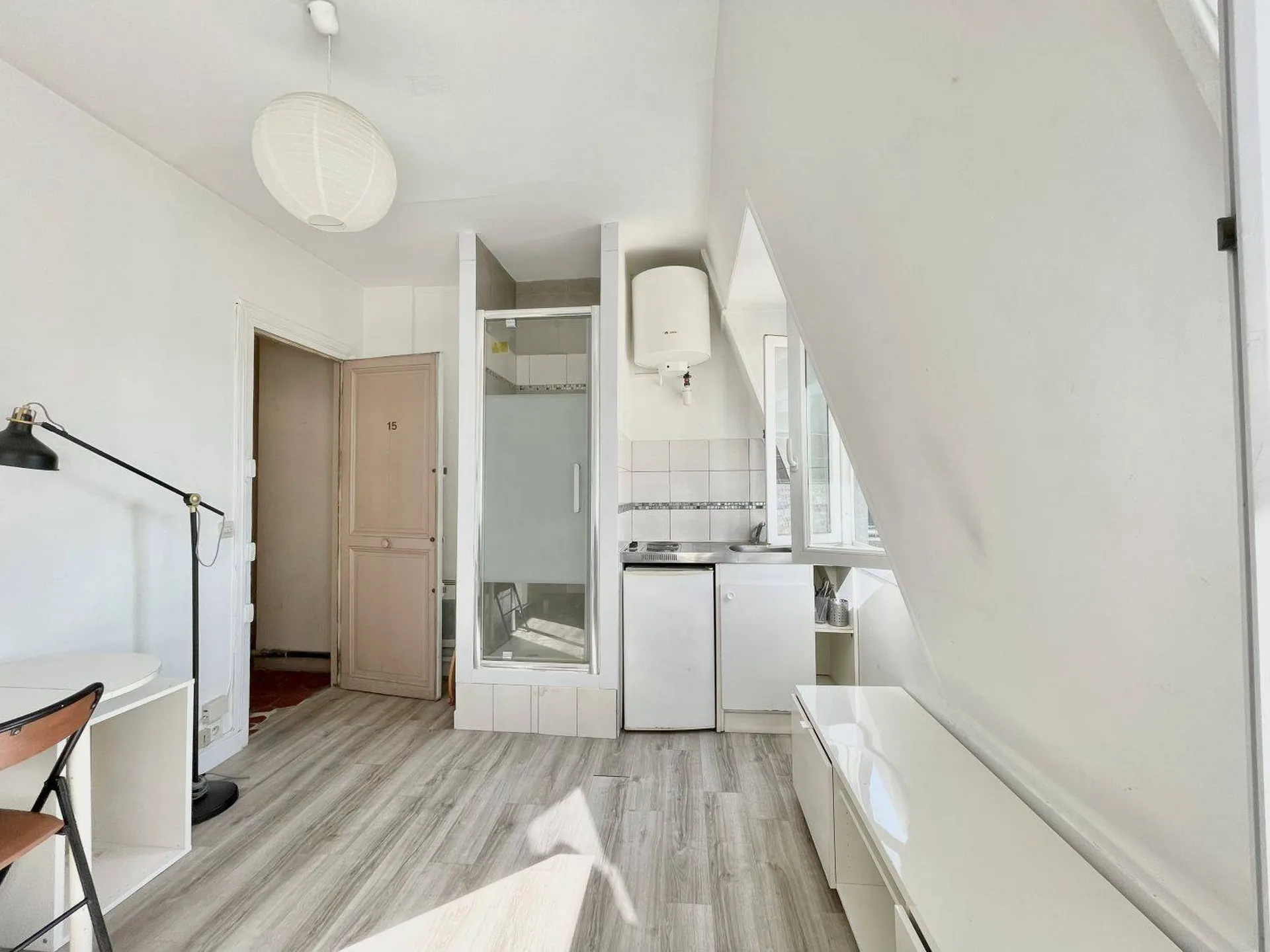 Situé au 6e et dernier étage par escalier de service cette studette comporte une pièce de vie avec 2 fenêtre (double vitrage), d'un coin cuisine, d'une douche et de rangements.