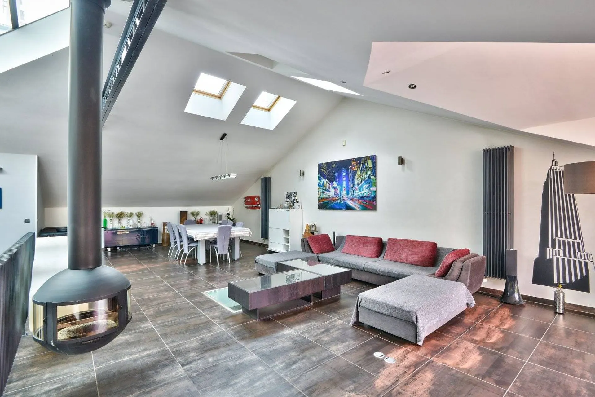 Ce séjour grand et spacieux, avec une très belle hauteur sous plafond et vélux laisse entrer une splendide lumière dans cette habitation.
