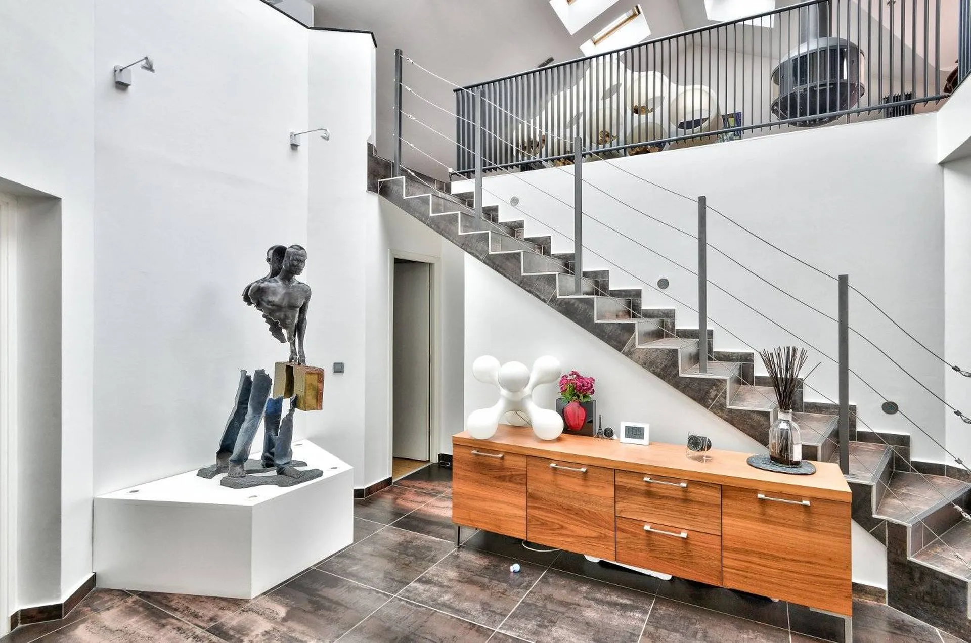 L’escalier menant à l’étage donne sur toute la pièce de vie principale ainsi que sur la cuisine.
